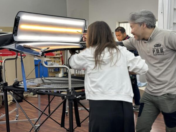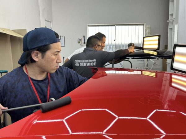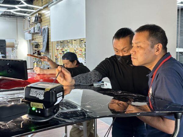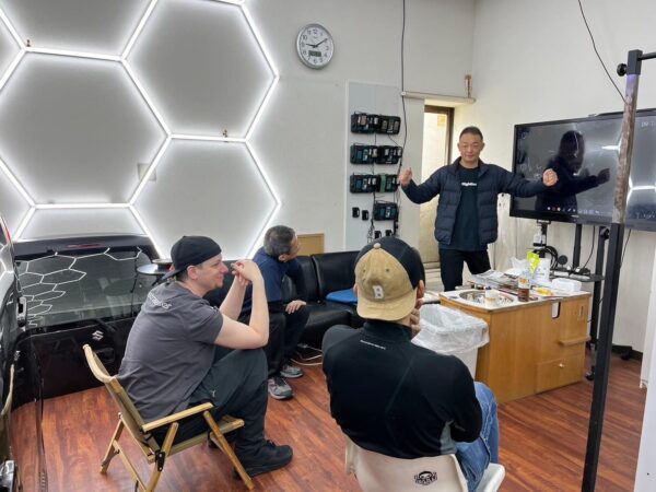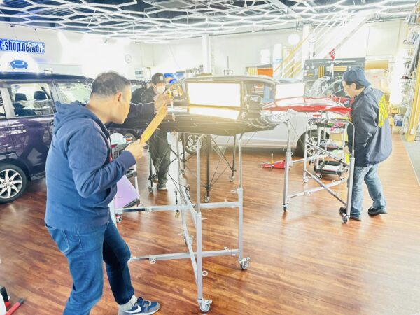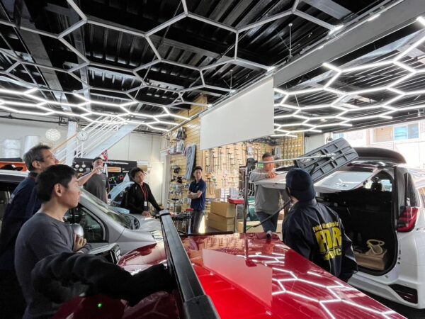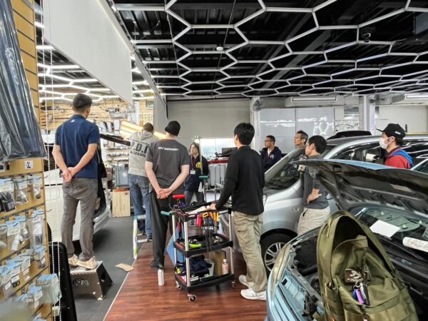 実際の作業は応用の連続 日々お預かりする施工を受講生のみなさんは解説を聞きながら立ち会う事が可能です。 実際の作業は応用の連続です。お客様のお車に触れることは出来ませんが、傍でしっかりと学んで頂いております。